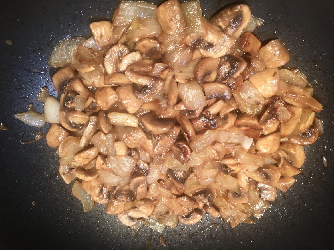 - Trocear la cebolla y los champiñones al gusto, y echarlos junto con la mantequilla, remover de vez en cuando y mantener el fuego fuerte para que no se acumule agua y no se cuezan los ingredientes.