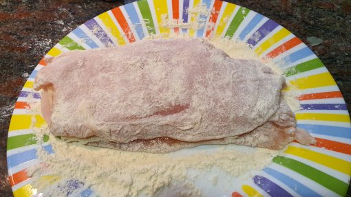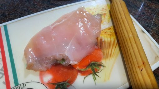 - Colocar las pechugas y golpear con un rodillo, un vaso, o cualquier otro objeto romo para aplanar lo máximo la pechuga y romper un poco las fibras. Colocar el exterior de la pechuga (la parte más brillante y lisa) arriba.