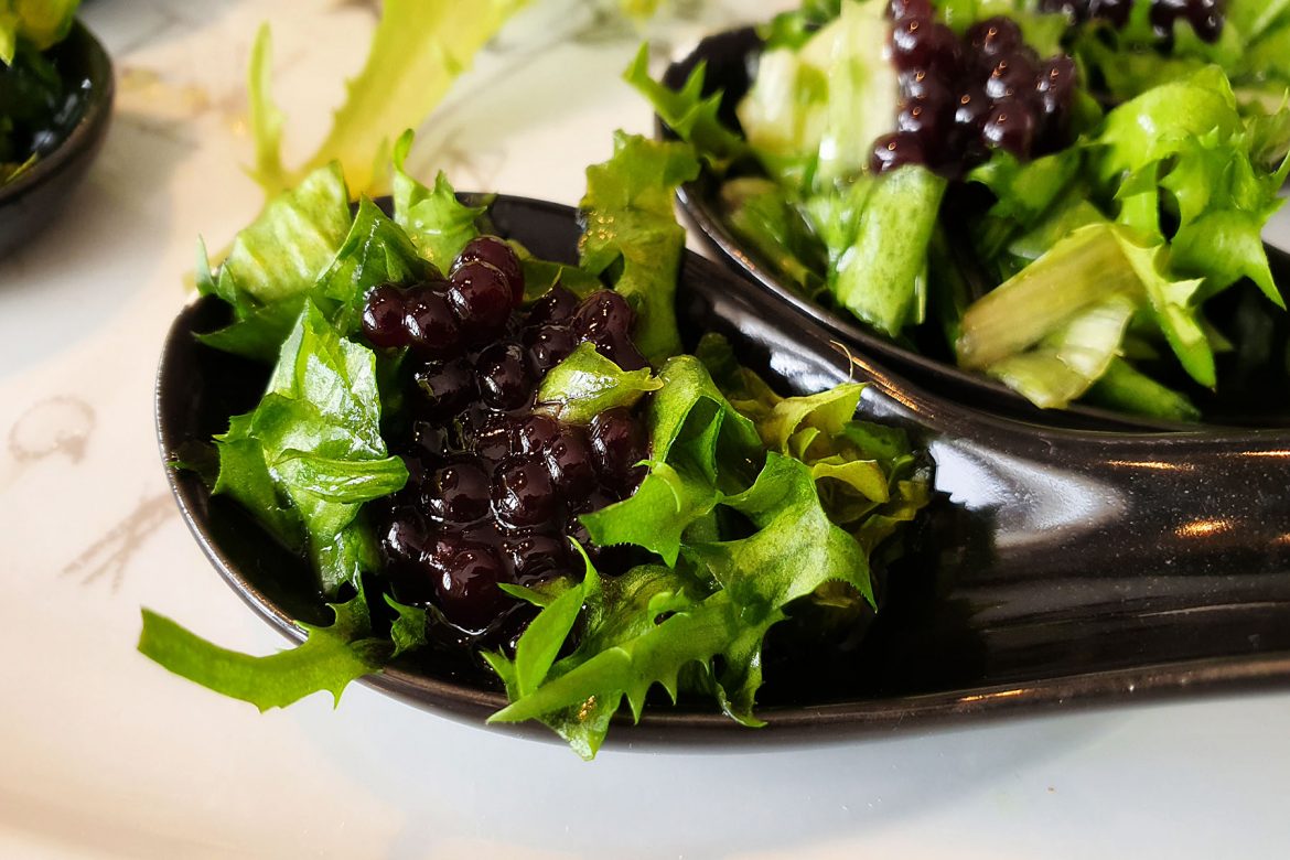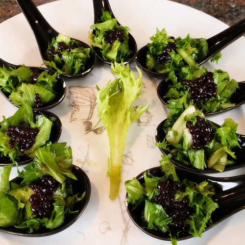 - Colocar en cucharas de servir junto con unas cuantas perlas de vino tinto