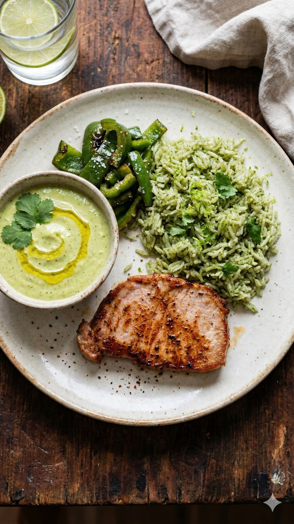 Lomo Glaseado con Arroz Esmeralda y Crudo de Pimiento