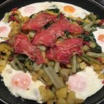 Antes de finalizar el salteado añadir los huevos en la superficie, aquí ya cada uno se las apaña para que los huevos se hagan, tapando sartén, chorrito de aceite encima del huevo, gotear aceite caliente de la sartén con una cuchara encima del huevo.