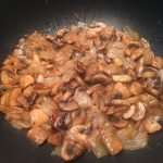 Trocear la cebolla y los champiñones al gusto, y echarlos junto con la mantequilla, remover de vez en cuando y mantener el fuego fuerte para que no se acumule agua y no se cuezan los ingredientes.
